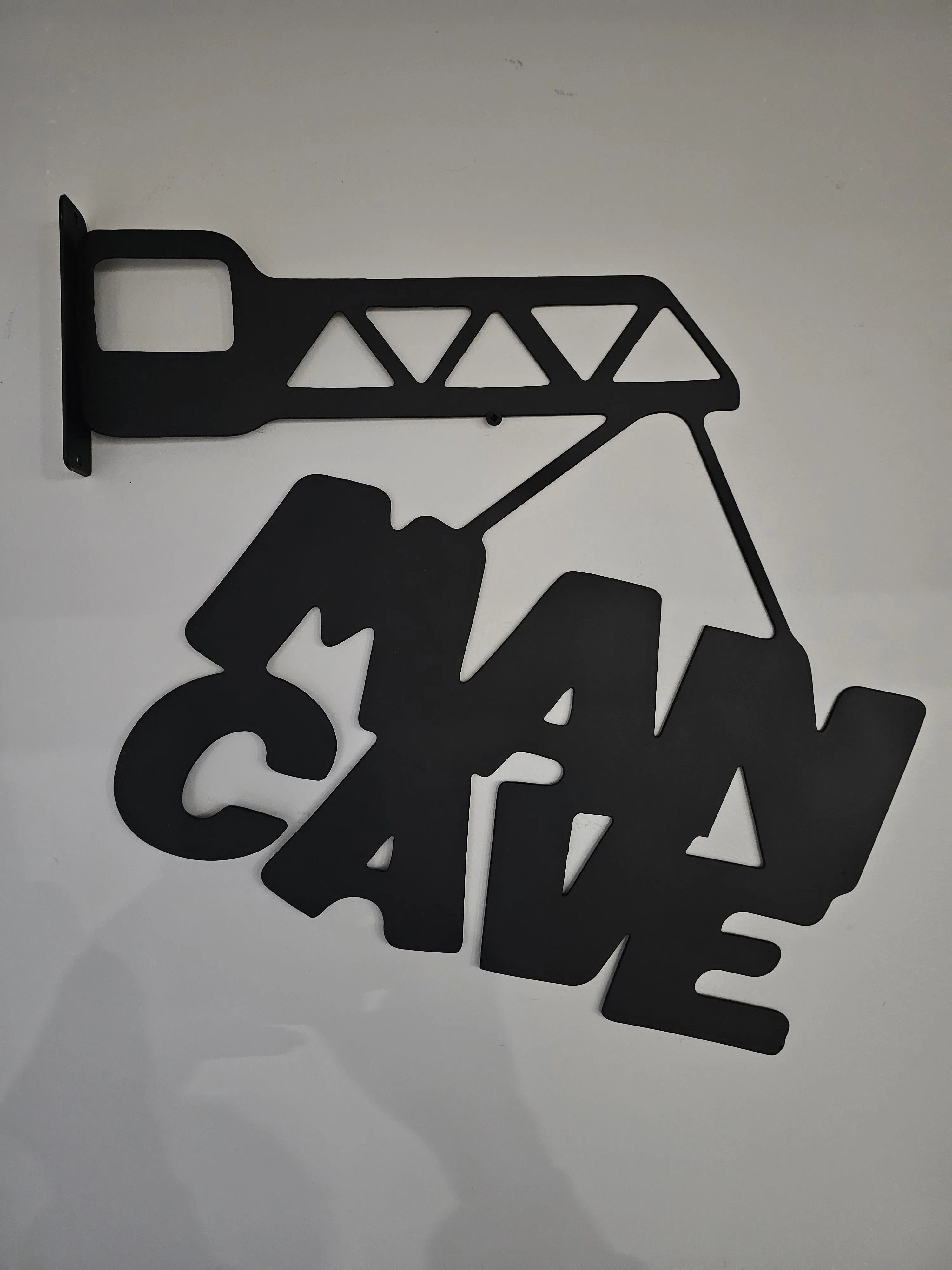 Metal man cave wall hanging from crane, Man cave crane, Metal crane