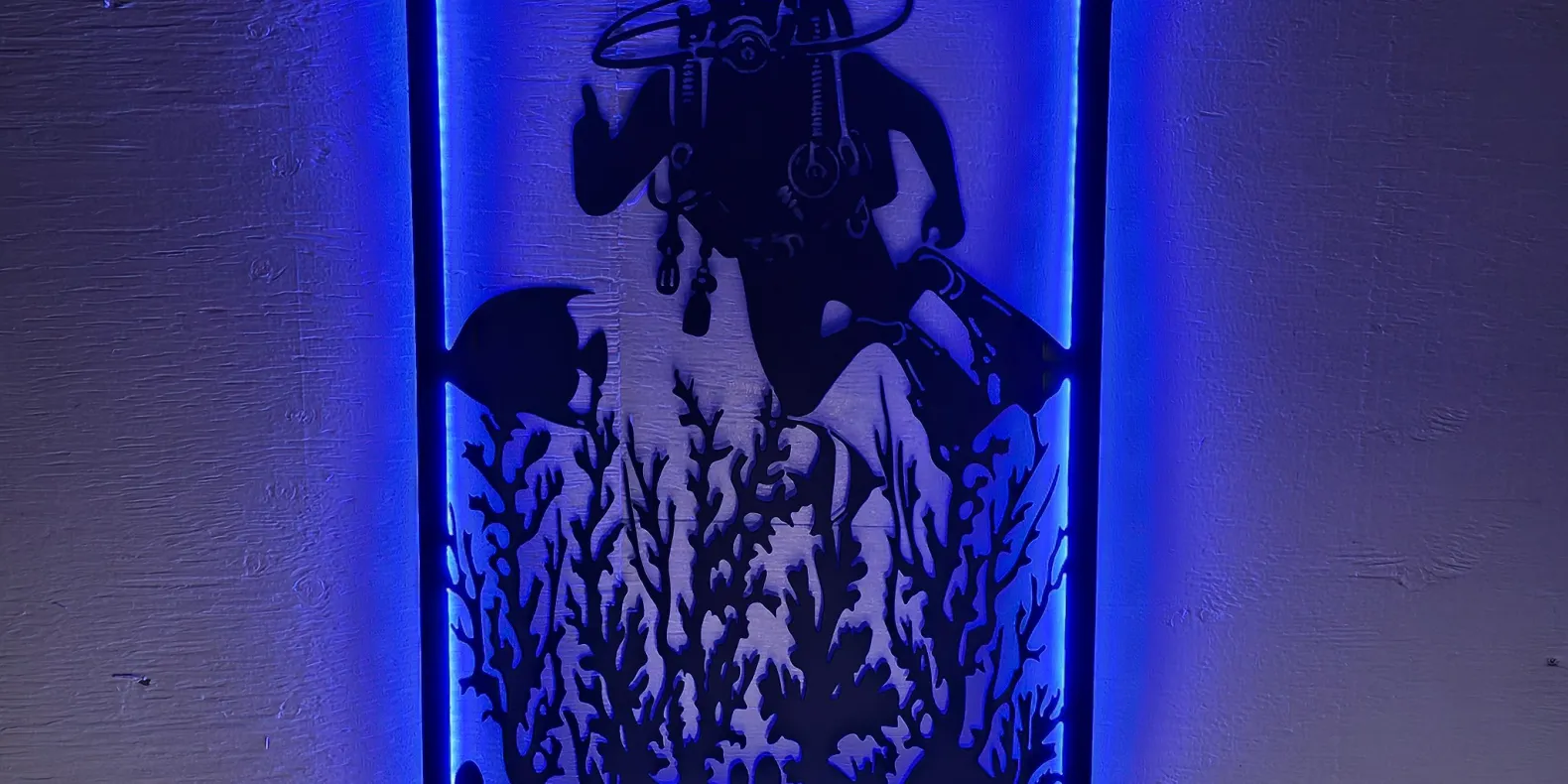 The Coral Diver Metal Sign is a striking decorative piece measuring 23x35 inches, perfect for adding a nautical or marine theme to any space. Featuring a detailed depiction of a diver surrounded by coral, this sign combines artistry with functionality. Backlit with energy-efficient LEDs, it emits a soft, ambient glow that enhances the design while creating a captivating atmosphere. Ideal for homes, offices, or themed establishments, this sign is both visually appealing and durable, making it a standout addition to your décor.
